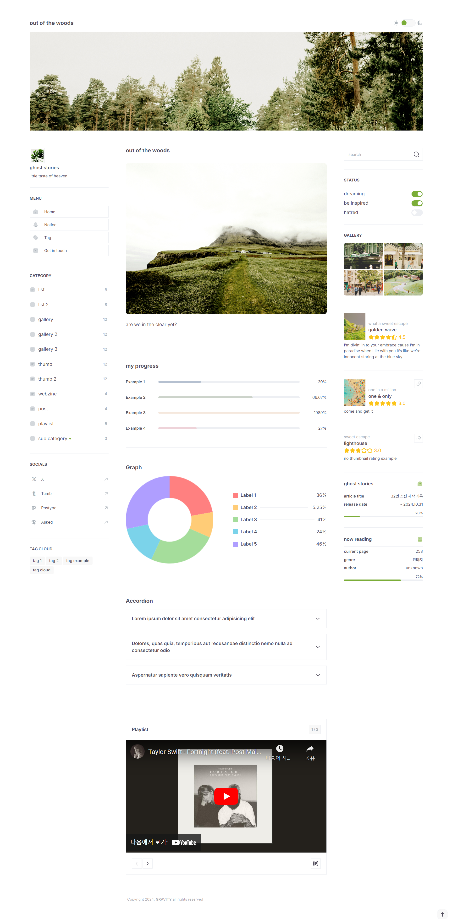 커버 13종 | 목록 1 - 선형 / 목록 2 - 박스형 / 갤러리 1 / 갤러리 2 / 갤러리 3 / 갤러리+제목 1 / 갤러리+제목 2 / 웹진 / 포스트 / 퍼센트바 / 아코디언 / 원형 그래프 / 유튜브 슬라이더